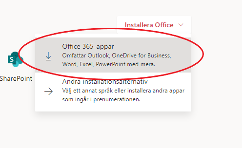 3. Och därefter på "Office 365-appar". Då startar en nedladdning och en instruktion till den. Följ instruktionen som visas på skärmen. Installationen tar normalt 5-30 minuter beroende på din internetuppkopplings hastighet.